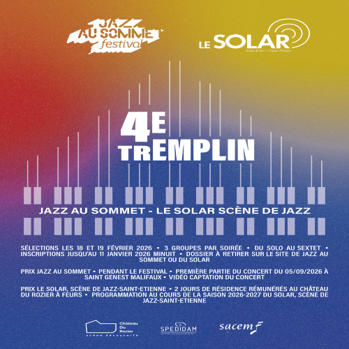 Soucieux de promouvoir les formations émergentes de la région, le Festival Jazz au Sommet et le SOLAR, scène de jazz-Saint Etienne, proposent une quatrième édition du tremplin Jazz. Six groupes pré-selectionnés joueront un set de 40 minutes devant un jury de profesionnels chargés de choisir deux projets. L'un d'entre eux recevra le Prix Jazz au Sommet : le groupe se produira lors de l'édition 2026 du Festival et bénéficiera d’une captation vidéo du concert. L'autre formation musicale sélectionnée remportera le Prix SOLAR, scène de Jazz de Saint-Etienne : une résidence de deux jours au Château du Rozier à Feurs ainsi qu’une programmation dans le cadre de la saison 2026-2027 du SOLAR.